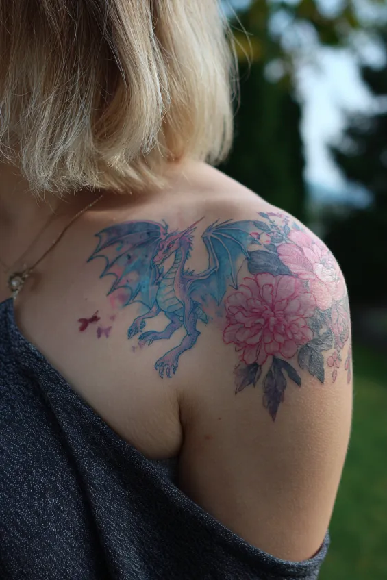 Soft blue tones blend into pink florals across a woman’s upper shoulder and outer back. The dragon curves gently through the blossoms, with airy shading that gives the design a watercolor inspired finish. The medium to large size spreads beautifully over the shoulder cap, creating a soft, rounded composition.
