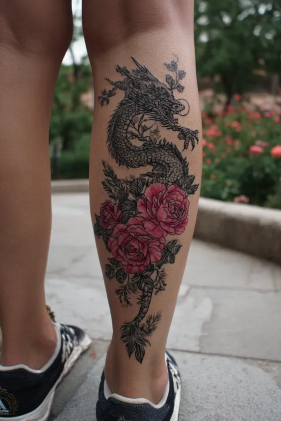A striking dragon coils down the back of a woman’s calf, wrapped around rich red roses and dark green leaves. The composition is vertical and medium to large in size, filling the calf with dramatic detail. The scales are bold and defined, while the flowers add softness and depth.