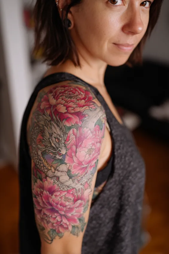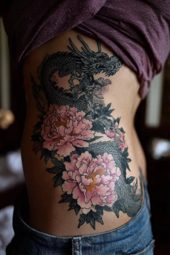 I cannot get over how stunning this placement is. Side tattoos feel a little daring in the best way, and pairing a fierce dragon with full peonies makes it even more unforgettable. It feels like wearing a secret garden guarded by something strong.