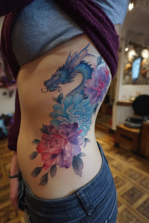 A large floral dragon stretches along a woman’s side torso, starting near the ribcage and flowing down toward the hip. Cool blue tones define the dragon, while pink blossoms cluster around its curves. The vertical layout enhances her natural shape and gives the design fluid movement.