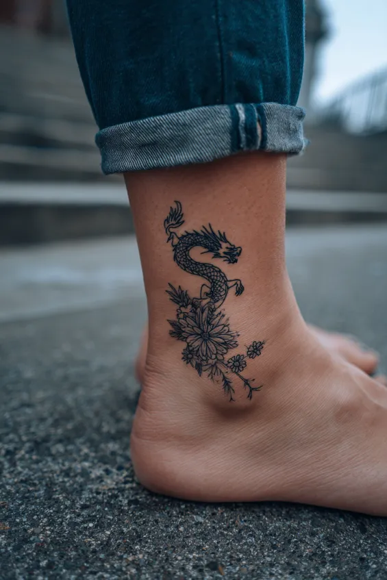 A small black ink dragon curls just above a woman’s ankle, surrounded by tiny floral accents. The design is petite and vertical, with clean linework and subtle shading that keeps it light and elegant. The placement feels delicate and easy to show off.