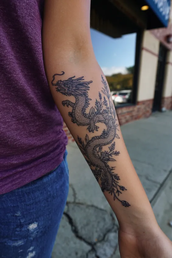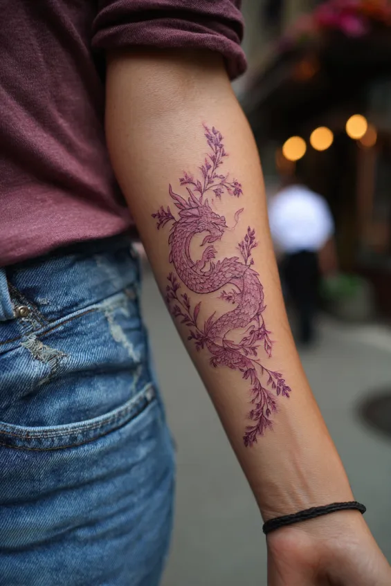 A medium sized floral dragon stretches along the forearm in gentle purple hues. The blossoms are integrated into the dragon’s curves, giving the design a flowing and cohesive look. The color choice adds a whimsical, almost watercolor inspired effect.