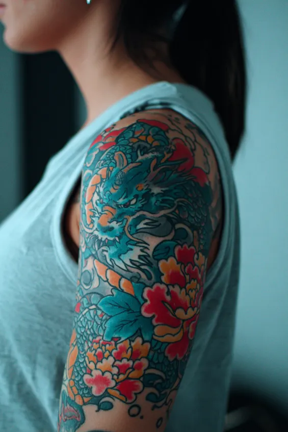 A colorful arm sleeve blends teal tones with pink and red blossoms, wrapping the entire arm in layered detail. The dragon winds through the florals, creating depth and movement from shoulder to wrist. The saturated colors make the large design feel bold and cohesive.