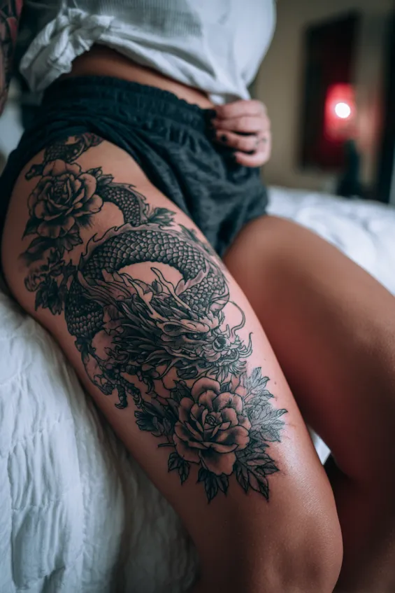 A bold blackwork dragon curves down the outer thigh, intertwined with softly shaded florals. The heavy dark ink contrasts beautifully against the petals, creating a striking balance between strength and delicacy. The dragon’s body follows the natural line of the leg, giving it fluid movement.