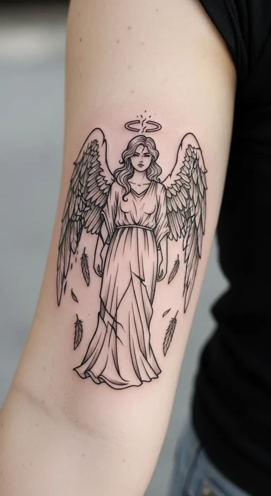 This piece is a stunning example of fine-line blackwork placed perfectly on the inner bicep or forearm. It features a defiant female angel with a fierce gaze and flowing hair, standing tall even as her halo snaps into two jagged pieces. The design is medium-sized and relies on clean, delicate linework to create depth in the feathers and the draped folds of her gown. Falling feathers float around her, adding a sense of movement and loss without needing any heavy shading or color. It is a strictly monochrome look that keeps things elegant but undeniably sharp.