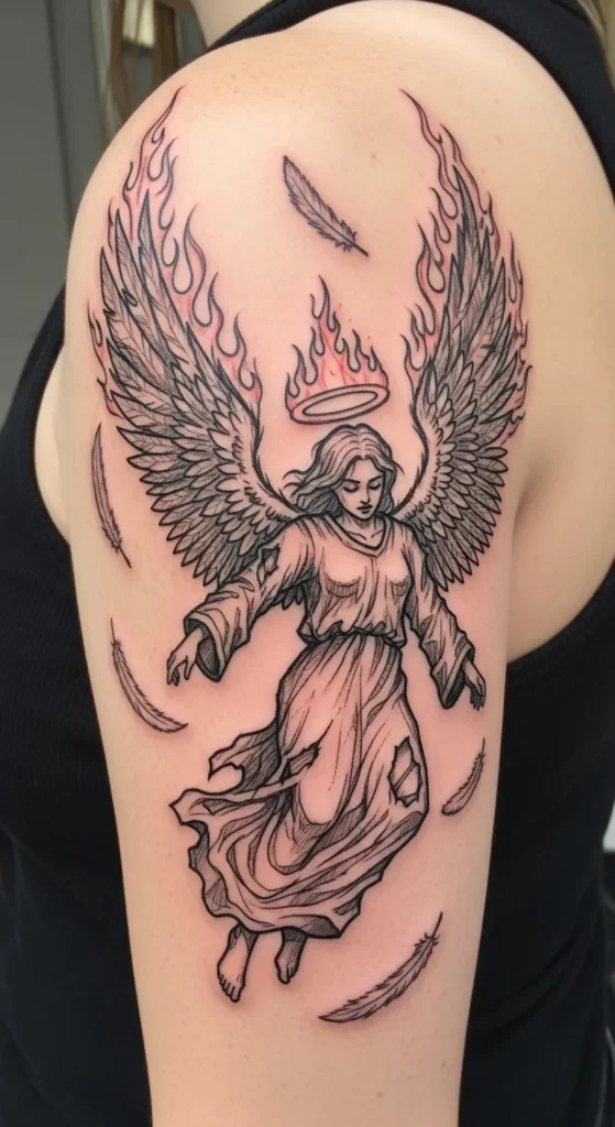 This bold shoulder piece features a classic fine-line illustrative style that packs a serious punch. The design depicts a female fallen angel in a tattered robe, floating gracefully while her large, feathered wings are engulfed in delicate red-ink flames. Floating feathers drift around her to add a sense of motion and weightlessness. The black ink is super crisp, using fine cross-hatching for shading, while the subtle pop of red around the halo and wingtips gives it that “straight from the underworld” vibe. It is a medium-to-large design that perfectly contours the upper arm, making it a total standout.