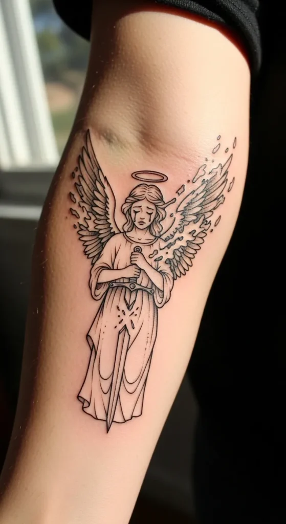 This fine line piece features a weeping angel positioned on the inner forearm, capturing a moment of profound vulnerability. The design is rendered in crisp black ink with delicate stippling used for shading in the wings and the folds of her long robes. While she wears a classic halo and traditional angelic attire, her wings appear to be disintegrating or shedding feathers into the air. She holds a large, downward-pointing sword that shows a distinct crack through the center of the blade. The size is perfect for the arm, filling the space without feeling overcrowded, and the lack of color keeps the focus entirely on the clean, illustrative linework.
