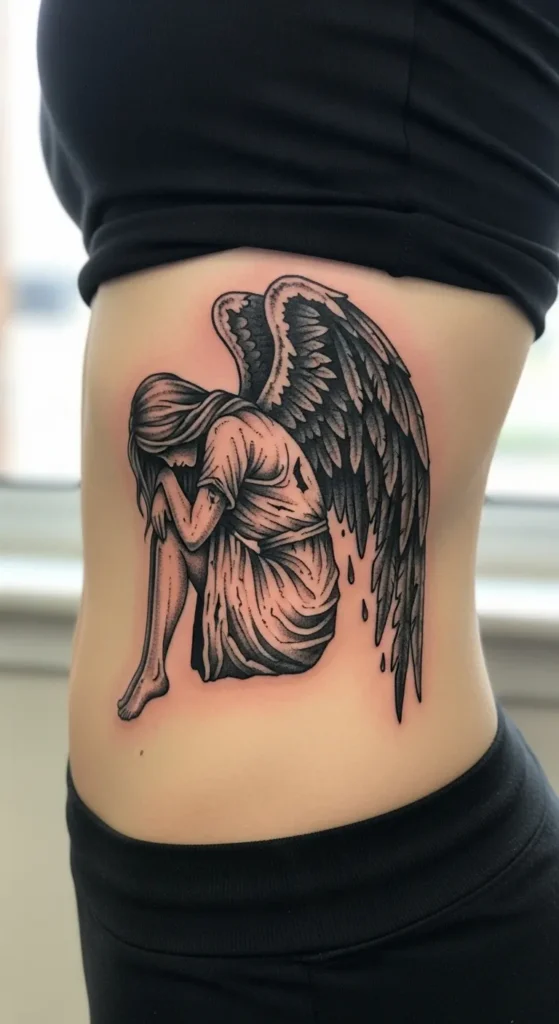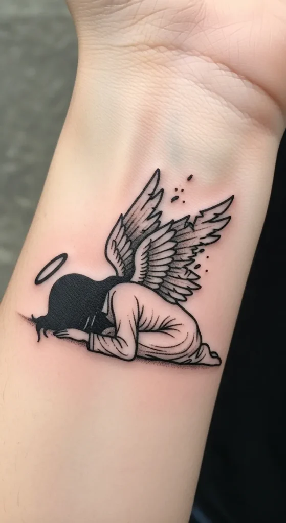 I find this piece captures such a raw and relatable vibe because it shows that even divine beings have moments where they just need to break down. The way she is huddled on the ground feels incredibly human and makes the whole fallen angel concept feel way more personal than a massive back piece. It is a beautiful choice if you want something that hints at your darker side while still looking soft and feminine.