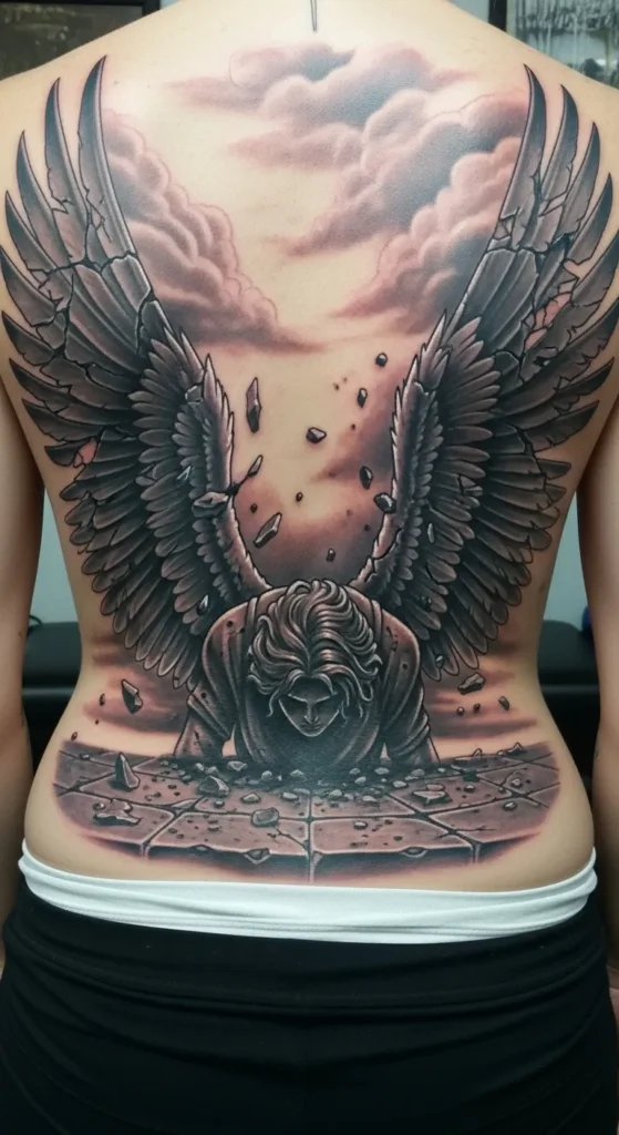 In my opinion, this design is incredibly moving because it captures that raw feeling of hitting rock bottom while still looking absolutely divine. There is a real strength in the way the angel is bracing himself against the floor instead of just giving up. It perfectly balances that edgy stone aesthetic with a softer emotional depth that really speaks to anyone who has had to pick up their own broken pieces. Plus, the way those wings frame the shoulder blades is just such a flattering look for a back piece.