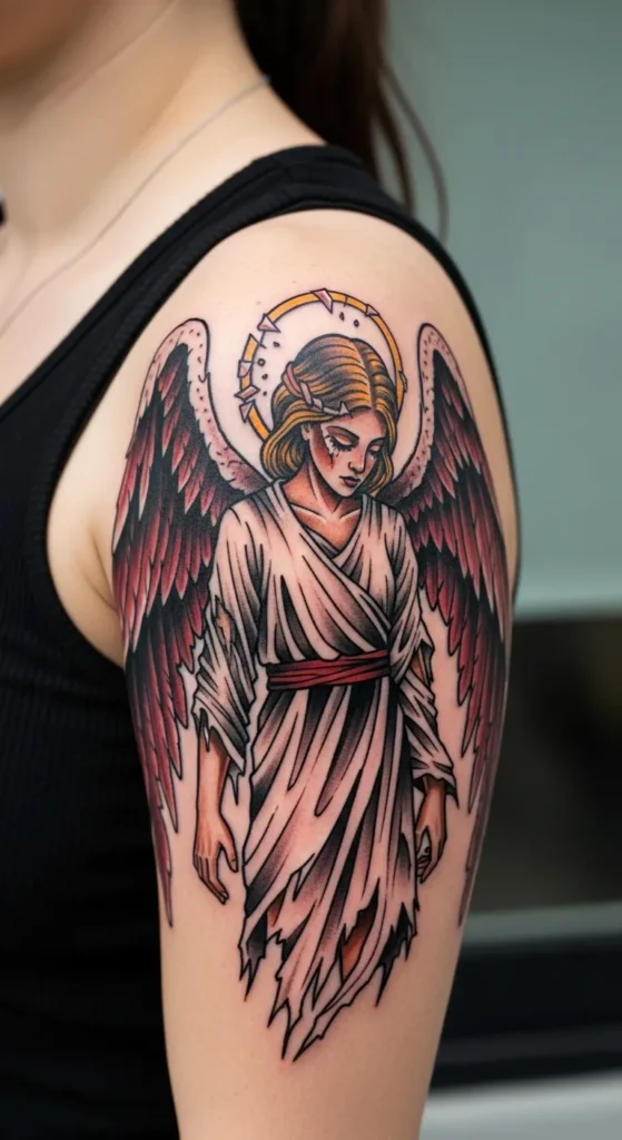 This upper arm piece captures a fallen angel in a stunning neotraditional style that really pops against the skin. The design features bold black outlines and a rich color palette of deep crimson and muted gold. You can see the intricate detail in the tattered hem of her white robes and the jagged shards of her shattered halo. The angel has a somber expression with dark streaks under her eyes, and her wings transition from a dark charcoal at the top to a vibrant, bloody red at the tips. It is a medium to large-scale tattoo that perfectly balances the delicate features of the face with the heavy, edgy weight of those massive wings.