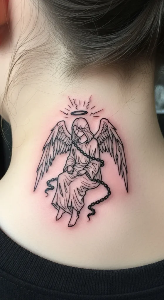 This fine-line piece sits beautifully on the back of the neck, featuring a hooded fallen angel in a medium scale that fits the space perfectly. The design is kept strictly monochromatic with clean black linework and subtle shading to give the flowing robes and feathered wings some depth. You can see intricate details like the cracked face hidden under the hood and a glowing halo emitting sharp light rays. A heavy black chain wraps around the figure, adding a gritty contrast to the delicate wings and dainty bare feet.
