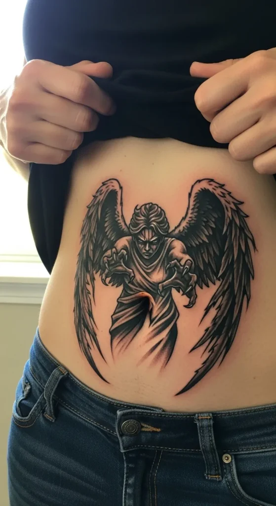 This bold stomach tattoo features a striking fallen angel emerging right from the center of the torso. The design uses heavy black and gray shading to create a moody and 3D effect, with the angel’s clawed hands reaching forward in a menacing pose. The wings are impressively detailed, stretching wide across the abdomen with sharp and tattered feathers that add to that edgy vibe. It is a large-scale piece that cleverly incorporates the belly button into the flow of the angel’s robes, giving the whole artwork a really unique and custom feel.