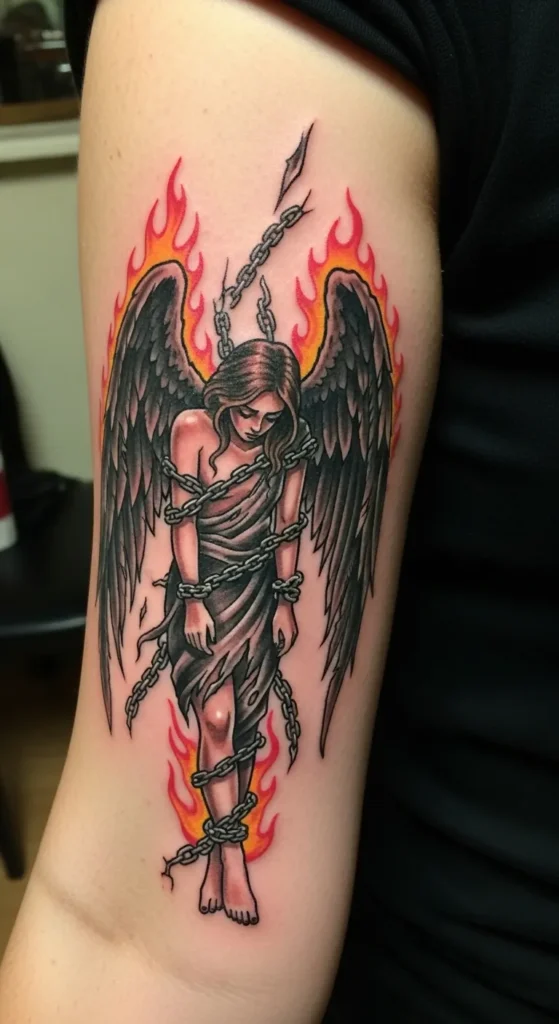 This bold forearm piece features a classic American Traditional twist on the fallen angel motif. The design showcases a sorrowful winged figure wrapped in heavy grey chains that appear to be snapping mid-air. She is framed by vibrant red and orange flames licking up behind her dark, feathered wings and around her feet. The style relies on thick black outlines and saturated colors to make the imagery pop against the skin. It is a medium-sized tattoo that uses clever shading on the angel’s robes and wings to add depth while keeping that iconic old school tattoo vibe.