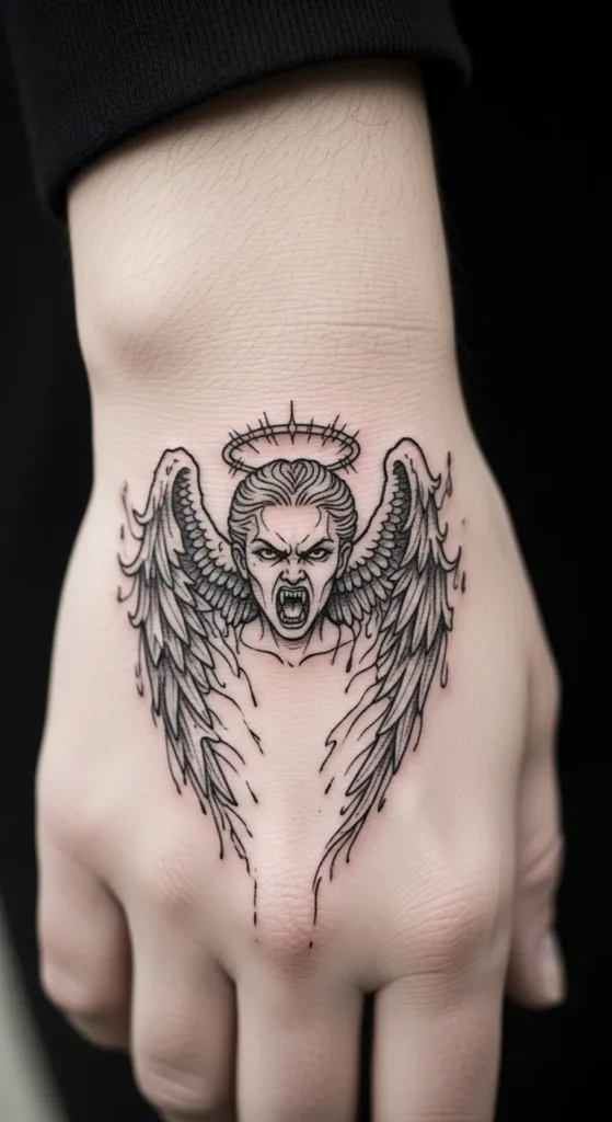 This design sits boldly on the back of the hand and features a screaming angel with a dark and vampiric twist. The tattoo is done in a sharp blackwork style with fine line detailing that brings out the intense expression on the angel’s face. You can see visible fangs and a spiked halo hovering above her head while her wings flow down toward the knuckles. The shading is subtle but effective, making the dripping effects on the feathers look almost liquid. It is a medium-sized piece that perfectly fits the anatomy of the hand, using the natural curves of the wrist to frame the top of the halo.