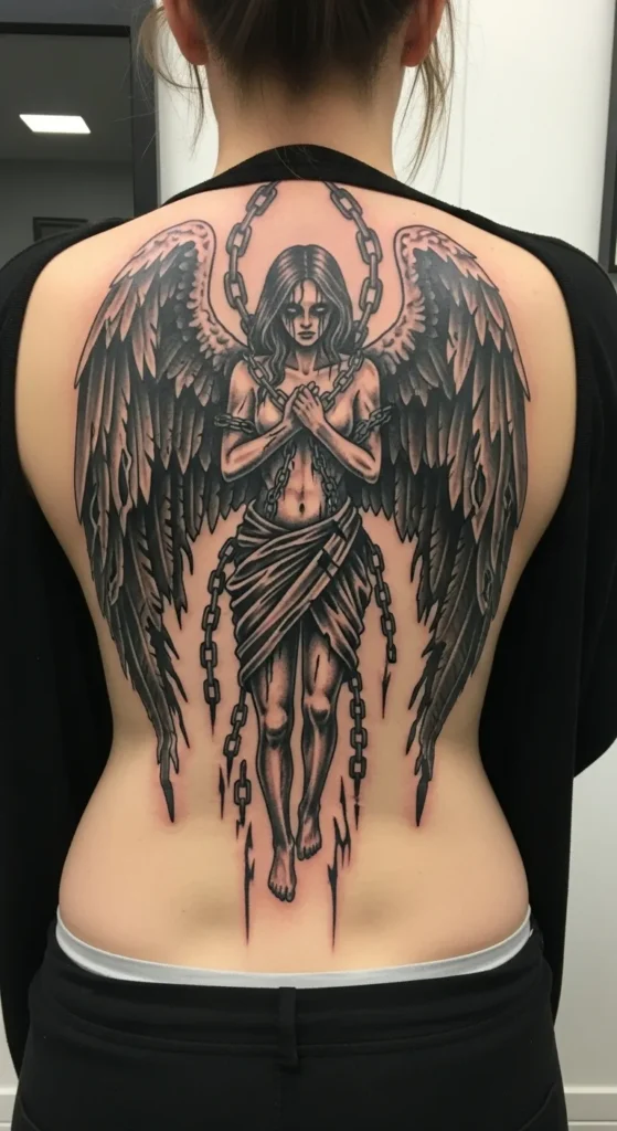 I find this piece absolutely captivating because it captures that raw feeling of being held back by your own history or internal struggles. There is something so hauntingly beautiful about the way she looks, both defeated and resilient at the same time. The placement is perfect since the spine acts as a natural anchor for the symmetry of those gorgeous wings. It is the ultimate choice if you want a design that feels like a secret strength hidden beneath your clothes, telling a story of a grace that has been through the absolute ringer and survived.
