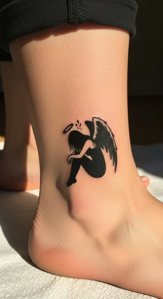 I love how this tattoo captures such a heavy mood through a very simple shape. There is something incredibly relatable about the “huddled” pose because it represents those moments when we all just need to pull inward and protect our energy. The broken halo is a clever touch that suggests a loss of innocence or a rebellious streak, which fits that edgy vibe perfectly. It feels like a secret little badge of resilience that you can easily hide under boots or show off with your favorite heels.