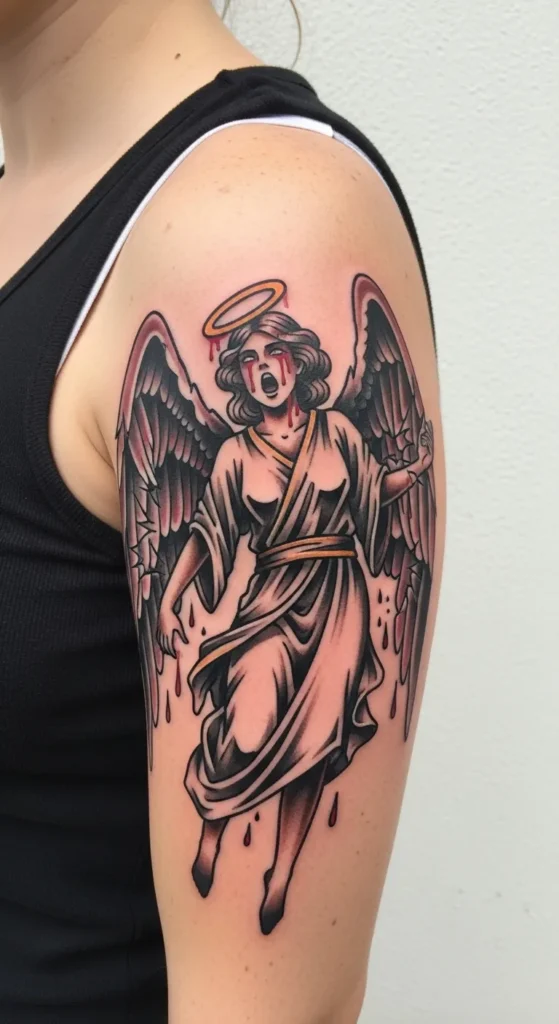 This bold upper arm piece puts a dark spin on classical imagery with a vibrant neotraditional flair. The design features a floating angel in mid-shout, complete with blank white eyes and deep red blood streaming down her face and dripping from her wings. It is a medium-to-large tattoo that uses thick black linework to define the flowing robes and feathered wings, while the color palette stays moody with muted greys and hits of golden yellow in the halo and belt. The pops of crimson really make the whole thing feel visceral and raw against the skin.