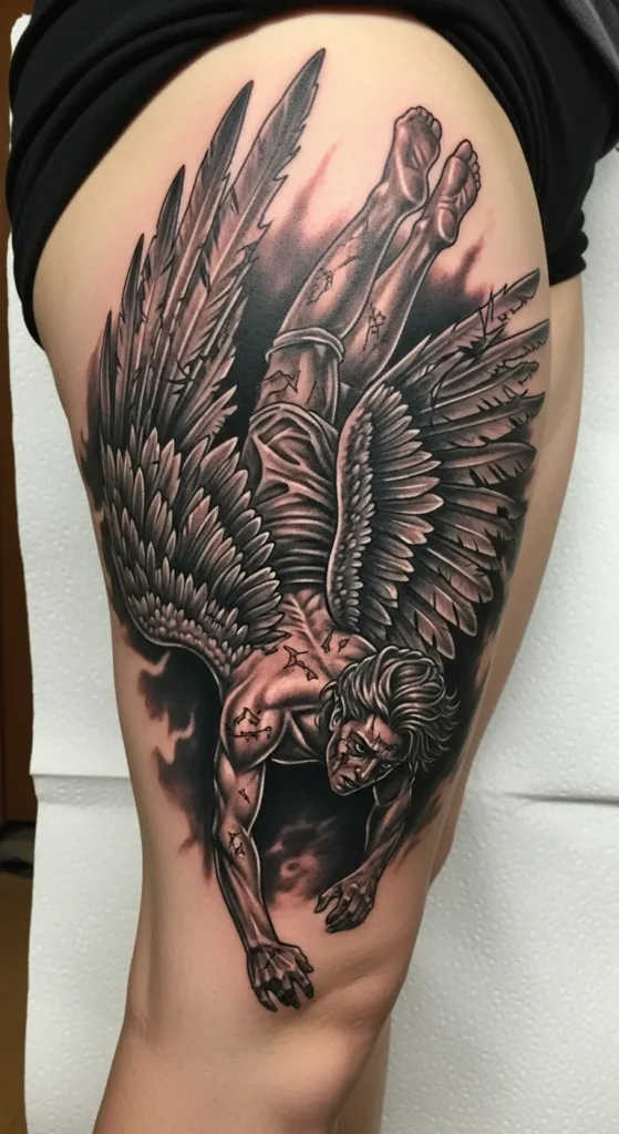 This striking black and grey realism tattoo takes up a bold amount of space on the upper thigh and captures a fallen angel in a state of midair descent. The detail is incredible, showing off muscular definition and feathered wings that look like they belong in a classical gallery. The artist used deep, smoky shading to create a sense of motion and shadow behind the figure. There are even subtle cracks and markings on the angel’s skin that give it a weathered, ancient feel. The monochromatic palette keeps the vibe sophisticated and intense, making the entire piece look like a dramatic charcoal drawing come to life.