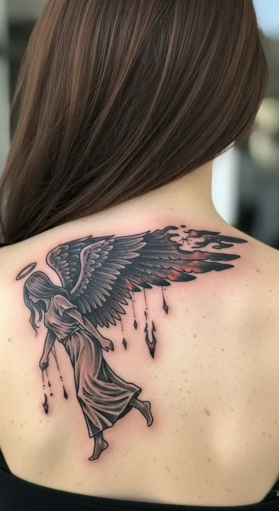 This gorgeous piece sits perfectly on the upper back and shoulder blade area, making it a prime choice for anyone who wants a design that flows with the body. The tattoo features a gracefully draped female angel in a neo-traditional style, complete with a floating halo and massive, detailed wings. One wing is beautifully intact with intricate feathering, while the other appears to be eroding or burning away into sharp, dark embers. The artist used a moody grayscale palette with subtle, warm transitions in the tattered wing tips to give it that scorched effect. It is a medium-sized design that feels substantial without taking over your entire back.