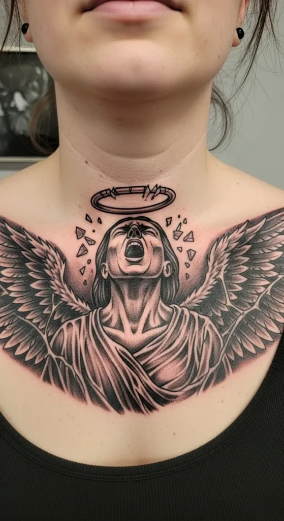 This bold chest piece captures a moment of raw emotional release through a powerful black and grey realism style. The tattoo features a female angel figure with her head tilted back in a visceral scream, her mouth wide open to convey deep pain or defiance. Above her head sits a broken halo with sharp shards floating around it, signifying a fall from grace or a loss of innocence. Her wings spread wide across the collarbones, filled with dense feather detail and soft charcoal shading that blends beautifully into the skin. The placement is perfectly symmetrical, using the natural curves of the neck and chest to ground the intense imagery.