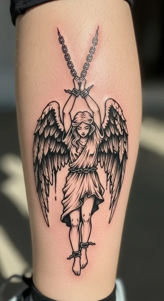 This bold calf tattoo features a stunning fallen angel rendered in a clean blackwork style. The design showcases a winged woman suspended in midair with her wrists and ankles bound by heavy chains that extend upward. The linework is crisp and high contrast, using thick outlines and delicate cross hatching to create depth in her flowing robes and feathered wings. It is a medium sized piece that uses only black ink, making the negative space of the skin pop against the dark shading of the feathers and the metallic texture of the shackles.