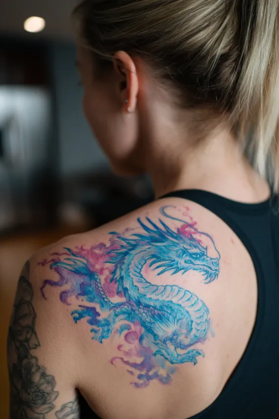 This stunning tattoo features a large watercolor dragon sweeping across the upper back and shoulder blade of a woman. The design bursts with shades of blue, pink, and hints of purple, giving the dragon a soft yet fiery presence. Its body curves gracefully along the natural shape of her shoulder, with fluid brushstroke details that make the wings and tail feel like they are in motion. The placement is bold but still feminine, hugging the upper back without overpowering it.