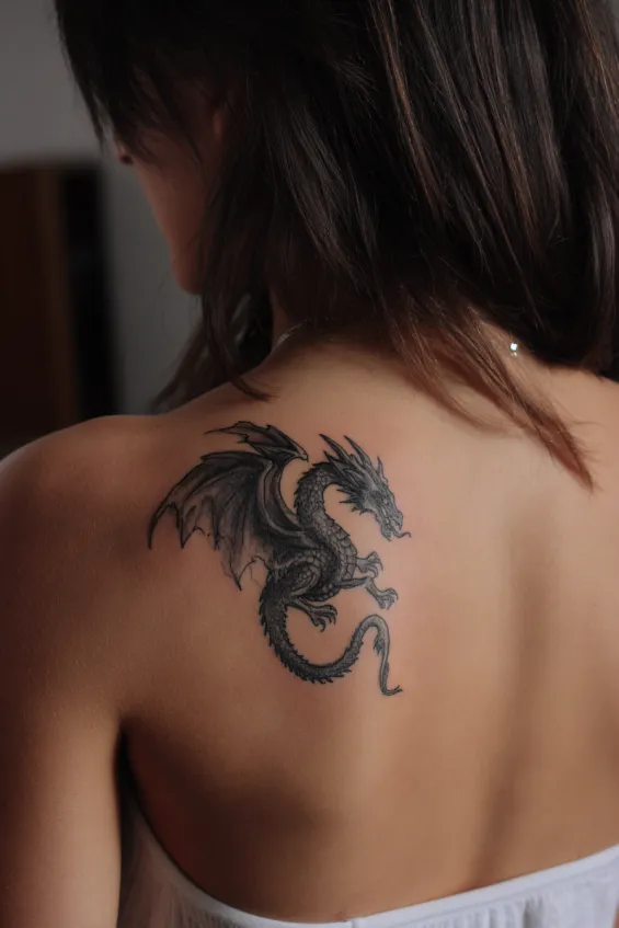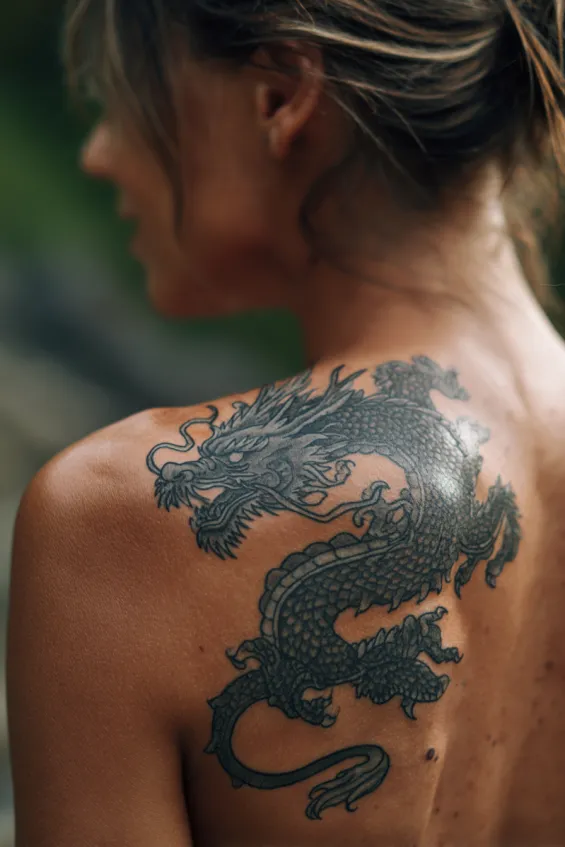 This design sits primarily on one shoulder blade, with the dragon’s body curling inward toward the center of the back. The shading is smooth and subtle, creating dimension without overwhelming the skin. The size is medium, making it noticeable but still refined and wearable.