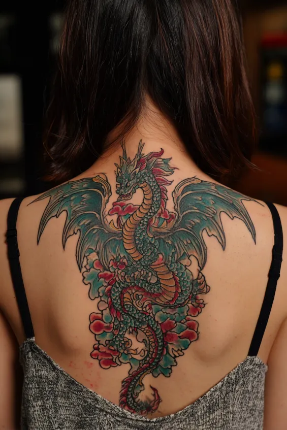 This breathtaking full back piece covers the entire upper and mid back of a woman with a richly detailed dragon surrounded by subtle floral elements. The design blends deep greens, muted reds, and soft shading to create depth and movement. The dragon coils across both shoulder blades and curves downward, its whiskers and tail flowing naturally with the shape of her back. The size is bold and immersive, making it a true statement piece.