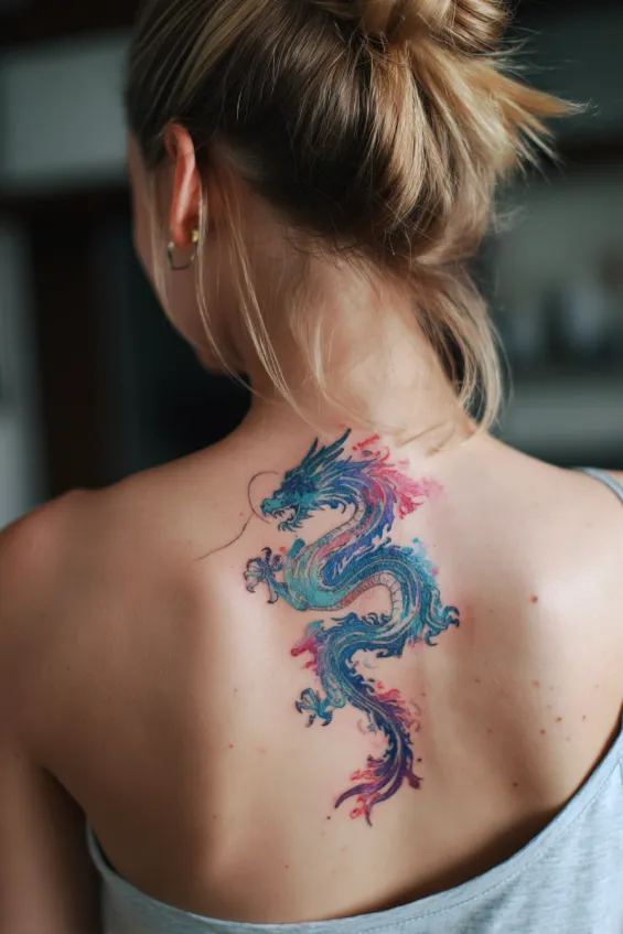 This design features a colorful dragon with soft blues and pinks blending together across the upper back. The body curves gently, and the watercolor effect gives it movement and lightness. The medium size makes it eye catching without covering the entire back.