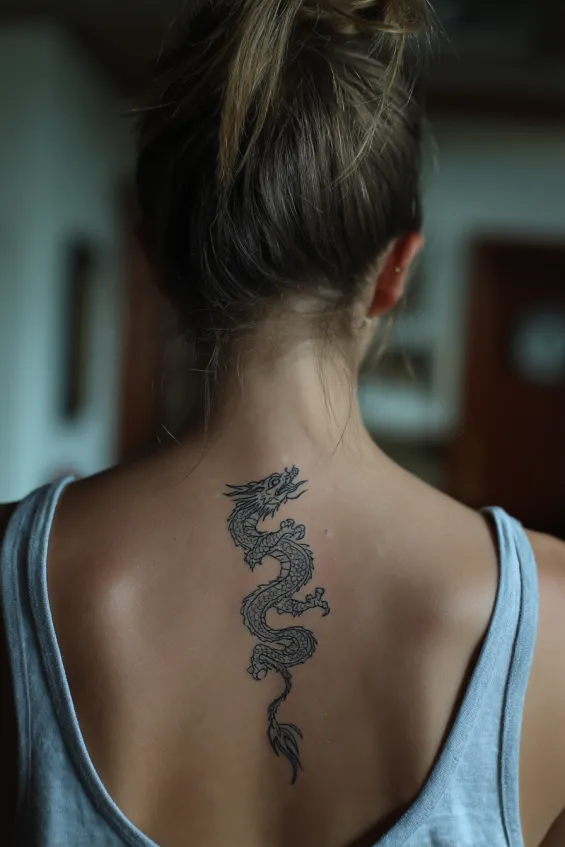 This design showcases a slender fine line dragon running vertically down the center of a woman’s spine. The tattoo is medium sized and done entirely in delicate black ink, with subtle scale detailing and a softly curved tail that follows the spine’s natural line. The simplicity keeps it elegant, while the placement creates a beautiful elongated effect across the back.