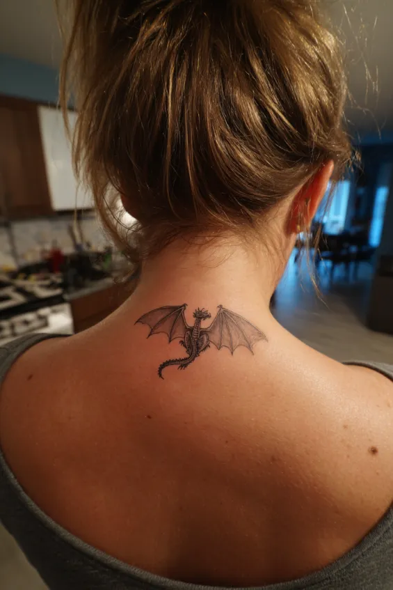 This small black and grey dragon tattoo sits perfectly at the nape of a woman’s neck, just below the hairline and centered between the shoulders. The wings are spread wide, creating a delicate horizontal frame, while the slim body curves downward in a soft flowing line. Fine line details define the wings and tiny scales, and the subtle shading inside the wings adds dimension without overpowering the design. The size is petite, making it feel refined and intentional rather than bold or overwhelming.