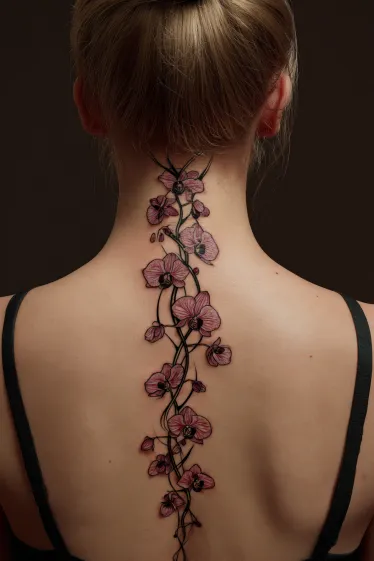This design features a graceful line of orchids flowing down the spine, each blossom connected by delicate black vines. The flowers are shaded in soft pink tones that add a feminine and romantic feel, while the dark stems give it contrast and structure. The placement runs neatly along the natural curve of the back, making the tattoo look almost like it belongs there by design. It is elegant, balanced, and beautifully detailed.