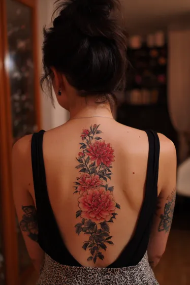 This tattoo features a breathtaking cascade of peonies running down the spine. The blossoms are rich in red and pink tones with darker shading that makes each petal look lush and full. The leaves frame the flowers beautifully, adding contrast in deep green hues. The vertical placement creates a balanced composition that flows perfectly with the shape of the back, giving the tattoo a natural yet striking elegance.
