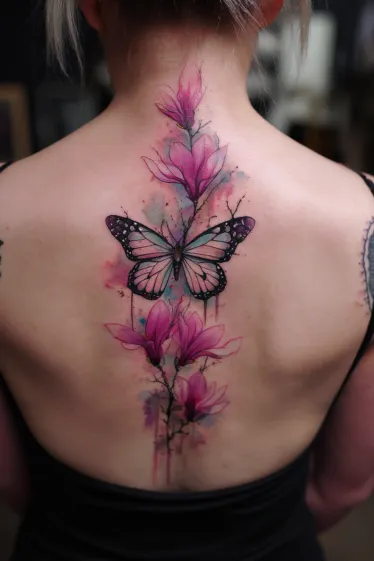 This tattoo showcases a delicate black and white butterfly resting at the center of the back, framed by vibrant magnolia blossoms in shades of pink and purple. The watercolor splashes behind the flowers add a dreamy effect, making the design feel soft and artistic. The vertical arrangement of the blossoms follows the spine naturally, while the butterfly breaks the flow in the most eye-catching way.
