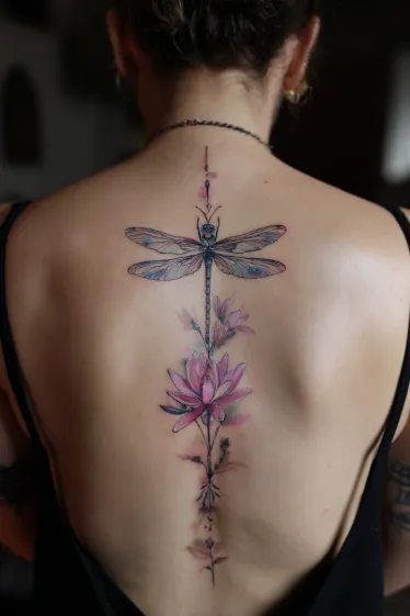 This tattoo features a graceful dragonfly stretched across the upper back with its wings detailed in soft shades of blue and violet. Beneath it, a vertical line of lotus blossoms flows down the spine in delicate pink and purple tones. The design feels light and airy, with each element carefully balanced to highlight the natural length of the spine. The subtle watercolor touches add softness, making the tattoo look almost ethereal.