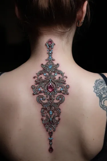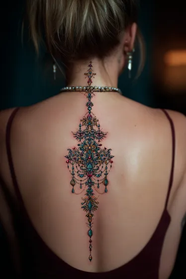 This tattoo features an intricate ornamental design flowing down the spine, reminiscent of a jeweled chandelier. Rich details in teal and ruby tones are framed by delicate black linework, creating a symmetrical pattern that sparkles with elegance. The design cascades gracefully, with bead-like elements that give the impression of fine jewelry draped along the back.