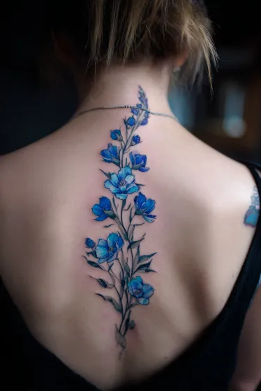 This tattoo shows a graceful line of vivid blue blossoms trailing down the spine. Each flower is detailed with soft shading that makes the petals almost glow, while the slender stems give the piece an elegant flow. The design follows the natural curve of the back, creating a vertical garden effect that looks refined and striking at the same time.