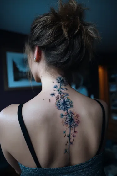 This tattoo features delicate dandelions arranged vertically down the spine, their fluffy seeds captured mid-flight. The blossoms shift from soft blue tones to hints of purple and pink, creating a gentle watercolor gradient. The design flows naturally with the back’s shape, giving the impression of petals drifting away on a breeze. It’s light, airy, and full of movement.