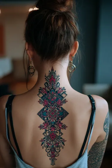 This tattoo looks like a piece of fine jewelry etched into the skin. It features an elaborate ornamental pattern flowing down the spine, with deep ruby red stones and shimmering turquoise accents framed by intricate scrollwork. The symmetry of the design enhances the natural line of the back, giving it a regal and luxurious appearance. It almost feels like wearing an heirloom necklace, but one that can never be taken off.