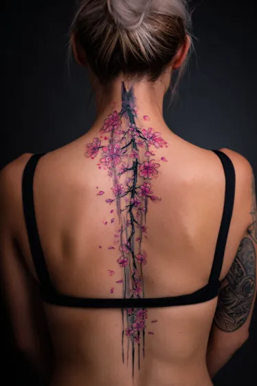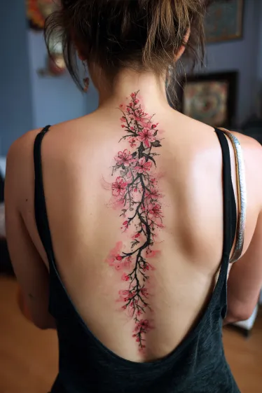 I think this tattoo is simply gorgeous because it balances elegance with a touch of playfulness. The blossoms add such a feminine charm, and the placement along the spine makes it feel graceful and eye-catching without being overwhelming. It reminds me of spring days and fresh beginnings, which makes it extra special.