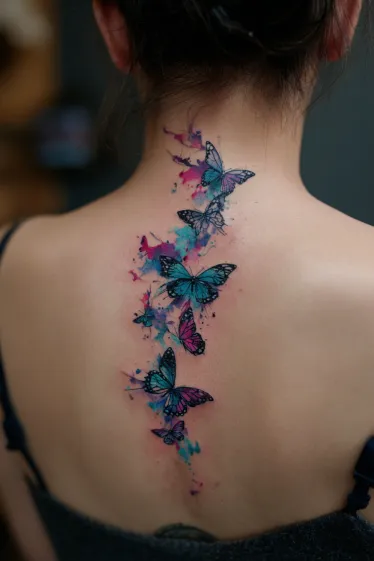 This tattoo features a trail of butterflies in shades of teal, purple, and blue, fluttering upward along the spine. The wings are detailed with fine black outlines, while watercolor splashes burst behind them in vibrant pinks and blues, adding a dreamy artistic effect. The placement follows the natural line of the back, creating a graceful flow that feels light and full of motion.