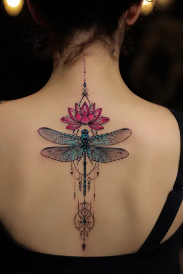 This tattoo combines a striking dragonfly with a blooming lotus at the top, creating a powerful vertical design down the spine. The dragonfly’s wings are detailed in soft shades of blue and violet, while the lotus glows in vibrant pink, giving the piece a beautiful contrast. Geometric accents and ornamental lines extend above and below, adding symmetry and elegance to the overall design.