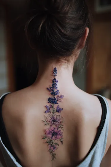 This tattoo features a graceful line of lavender stems rising from the lower spine, accented with soft pink wildflowers in bloom. The flowers are drawn with fine detailing and subtle watercolor shading, giving the design a natural and airy look. The vertical flow highlights the spine beautifully, while the combination of purple and pink tones creates a soothing and feminine palette.