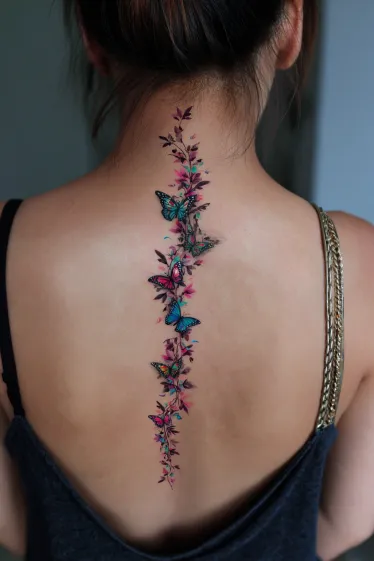This tattoo features a delicate vine of pink blossoms running down the spine, with vibrant blue butterflies fluttering gracefully among the leaves. The fine linework of the branches contrasts beautifully with the bold colors of the butterflies, creating a lively and elegant design. The vertical arrangement keeps it balanced and natural, making it flow perfectly along the back.