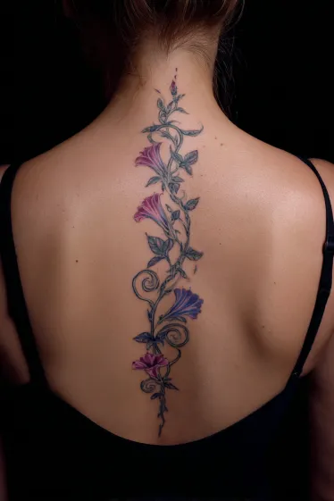 This tattoo showcases a winding vine of morning glory flowers flowing down the spine in shades of purple, pink, and blue. The curling stems weave gracefully along the back, with leaves adding depth and balance to the design. The blossoms are soft yet vibrant, and the vertical placement enhances the body’s natural shape, making the tattoo look both elegant and fluid.