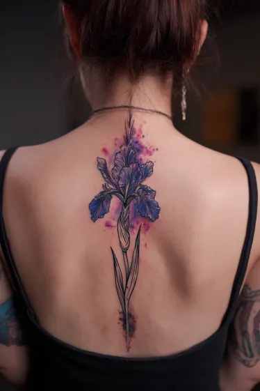 This tattoo features a single elegant iris placed vertically along the spine, its petals shaded in deep purples and soft blues. The design is accented with watercolor splashes in pink and violet, giving it a vibrant artistic edge. The leaves extend downward with clean lines, balancing the bold blossom at the center. The result is a piece that feels both graceful and striking.