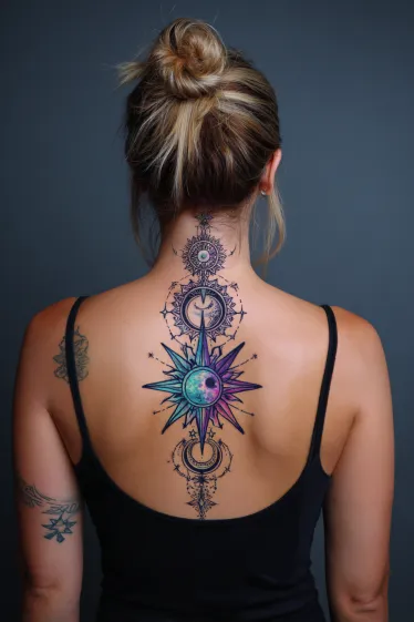 This tattoo features a breathtaking cosmic design running down the spine, with intricate mandala-inspired details surrounding a radiant starburst. At the center sits a glowing planet in teal and violet shades, giving the whole piece a mystical energy. The balance of geometric patterns with flowing celestial elements makes the design look both structured and otherworldly.