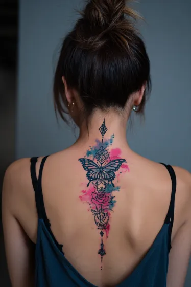 This tattoo features a bold butterfly at the center of the spine, with roses and ornamental details extending vertically above and below. The butterfly’s wings are shaded in deep blues and blacks, while splashes of watercolor pinks and purples add a soft, artistic touch behind the design. The roses bring in a romantic element, while the geometric accents tie everything together with a modern edge.