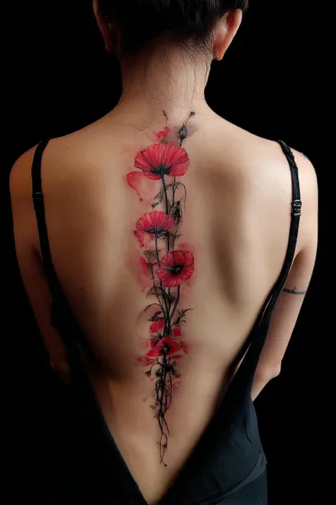 This tattoo features a striking line of red poppies blooming down the spine. The petals are shaded with watercolor effects, blending soft pinks and deep reds that give the flowers a painted look. Thin black stems and leaves add contrast, creating an elegant balance between bold color and delicate linework. The vertical placement enhances the natural flow of the back, making the design both graceful and eye-catching.