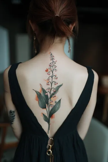 I find this tattoo so elegant because lily of the valley symbolizes purity and renewal, which feels beautifully meaningful for a spine piece. The mix of soft blossoms with strong green leaves gives it balance and makes the whole design stand out without being overwhelming. To me, it’s the kind of tattoo that feels timeless and understated, yet full of charm.